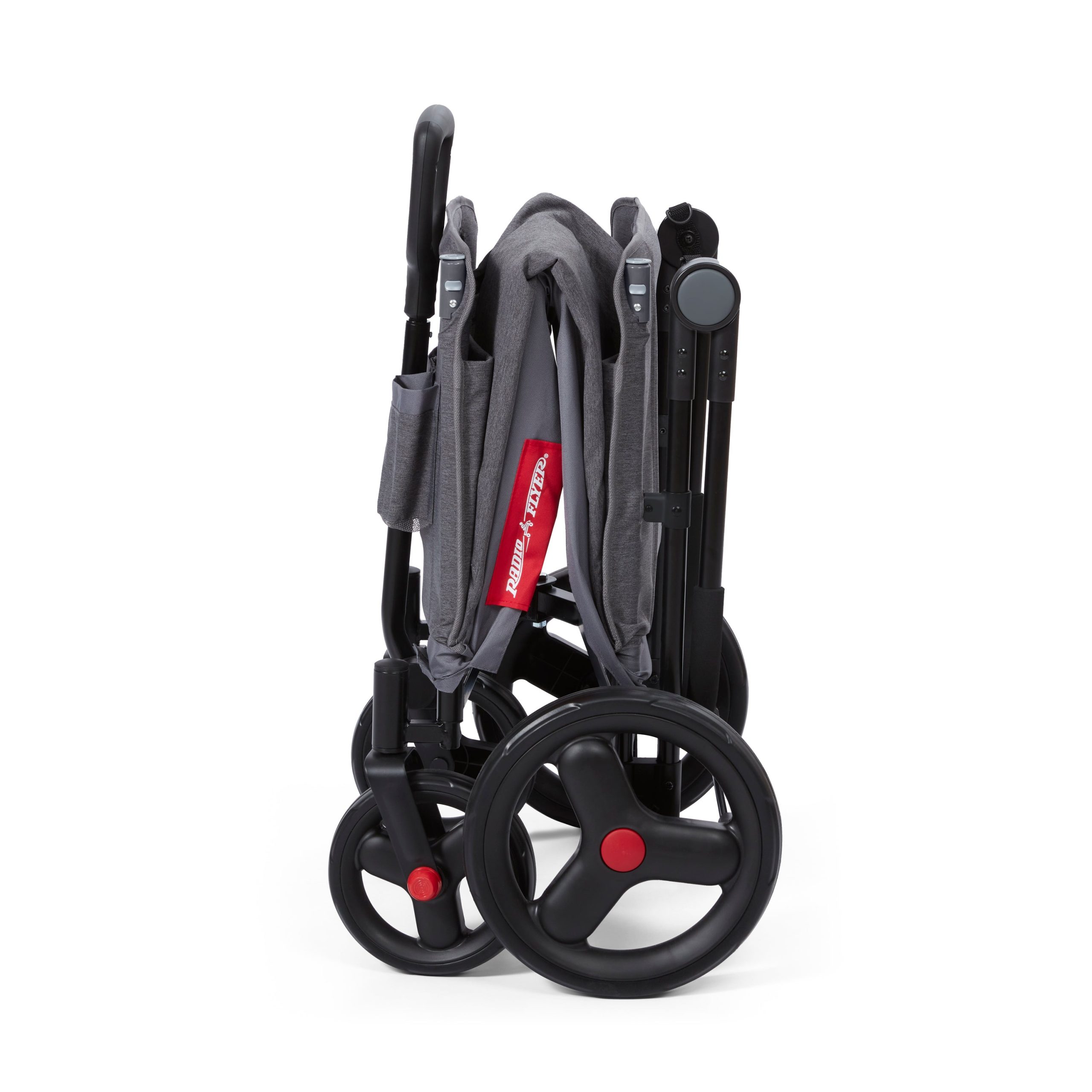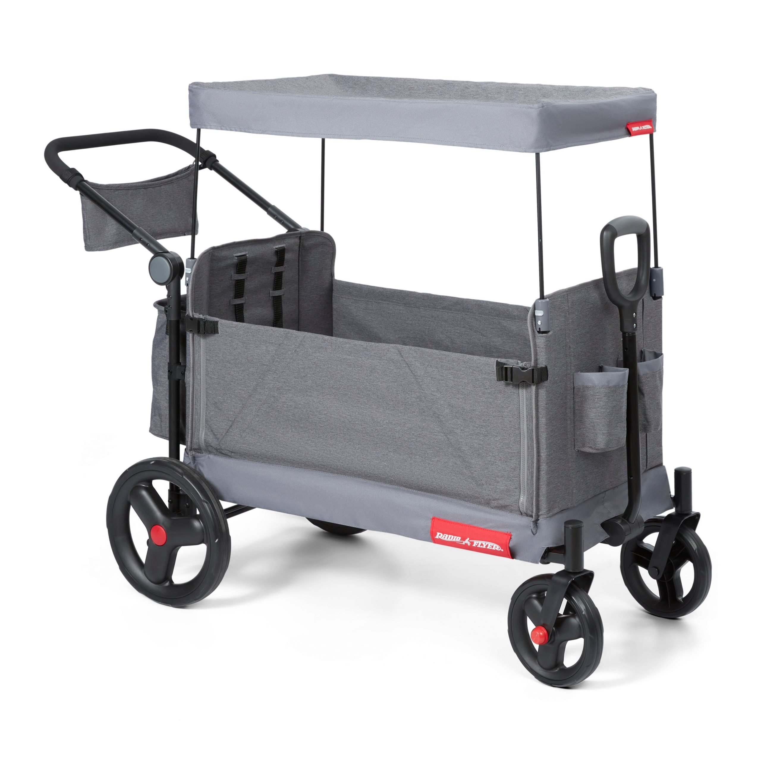 Radio Flyer’s Journey Stroll ‘N Wagon? brings comfort to every stroll! Ideal for families on-the-go. this wagon can be push or pulled. The Never Fall? pull handle stays upright in the front and the push handle adjusts to your height. When not in use. the Journey Stroll ‘N Wagon? easily folds up for storage. Keep little ones as young as 12 months safe and comfortable with two 5-point safety harnesses. internal storage pockets. UV protection canopy. and a rear brake. Thoughtfully designed parent features like cup holders. XL rear storage bag. and the push bar parent caddy make this the ideal vehicle for your whole family. The side zips down for stationary bench seating or easy entry. It also features DuraClean? 2.0. our highest quality fabric. which is durable. easily cleaned and made to last. Maximum weight capacity 120 lbs. For toddlers and kids 1+ years.?