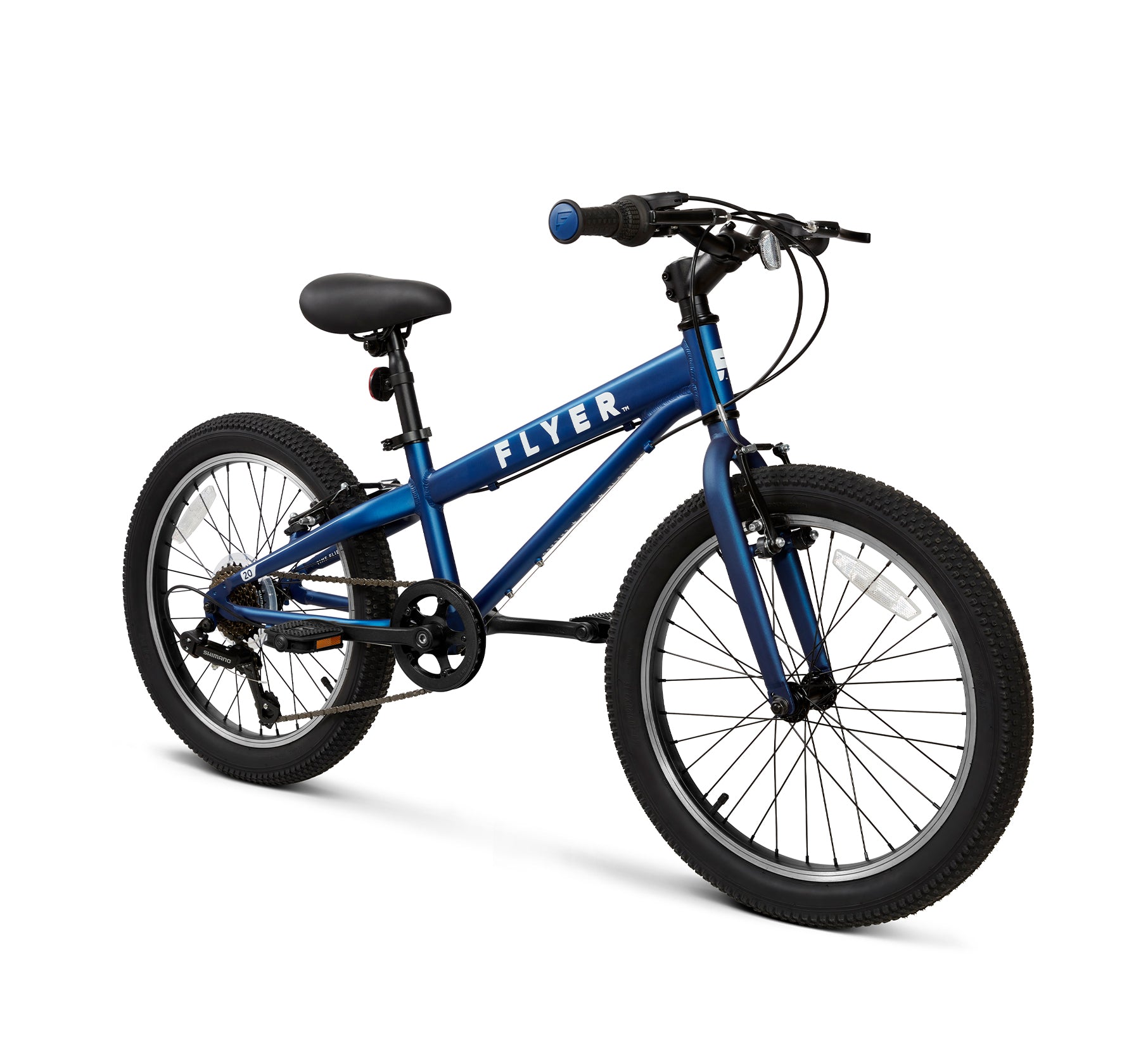 Bring the Flyer? fun and adventure home to your kids with the Flyer? 20 Kids’ Bike. This bike features a lightweight. durable aluminum frame. Built for speed and style. it features a 7-Speed Shimano Shifter and derailleur gear assembly. This bike is equipped with front and rear hand brakes so riders can make quick. controlled stops. The 20 durable tires absorb bumps and provide a smooth ride. The seat height is adjustable. allowing the bike to grow with your child. Recommended for kids ages 6 ?C 8 years. or riders 45 ?C 52 tall.