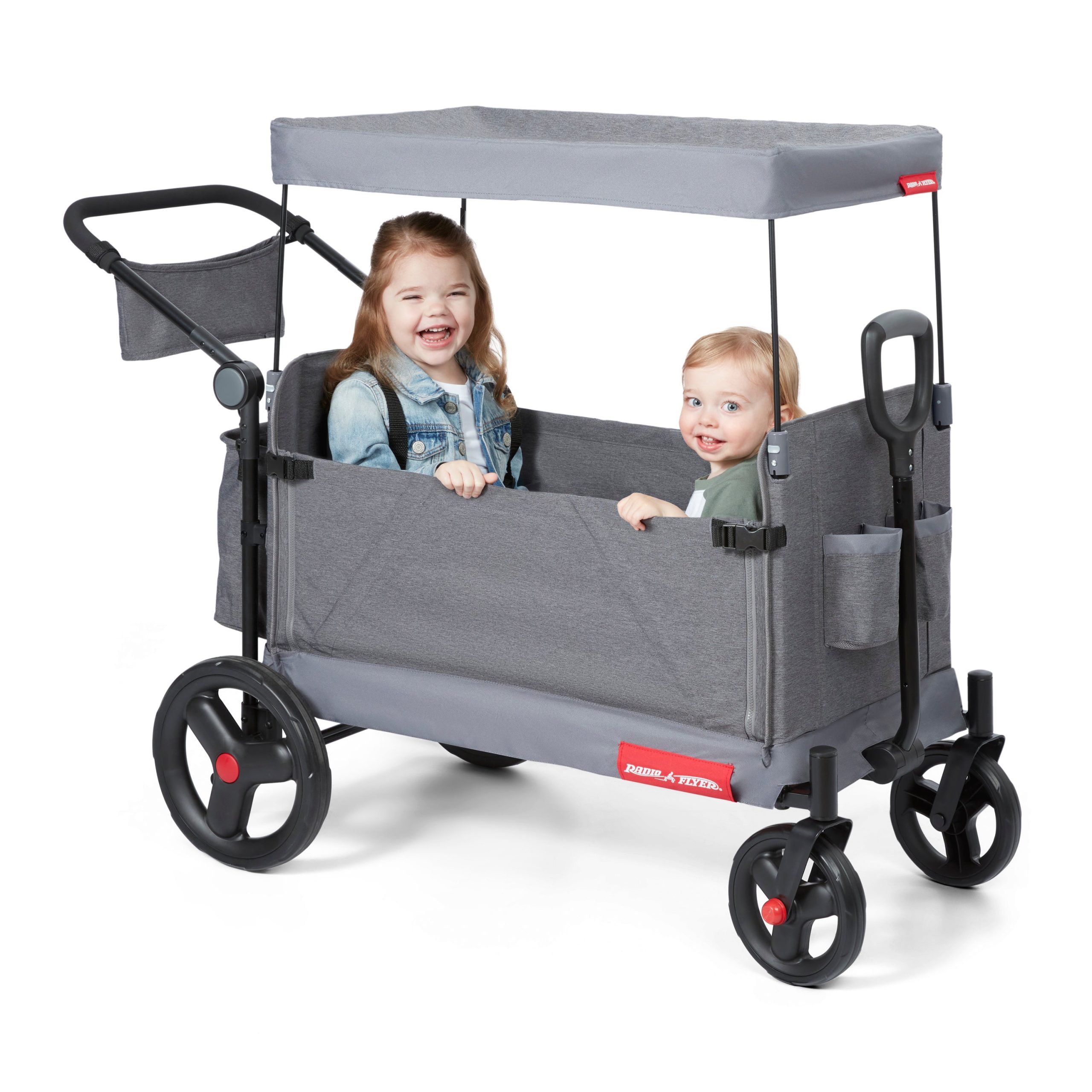 Radio Flyer’s Journey Stroll ‘N Wagon? brings comfort to every stroll! Ideal for families on-the-go. this wagon can be push or pulled. The Never Fall? pull handle stays upright in the front and the push handle adjusts to your height. When not in use. the Journey Stroll ‘N Wagon? easily folds up for storage. Keep little ones as young as 12 months safe and comfortable with two 5-point safety harnesses. internal storage pockets. UV protection canopy. and a rear brake. Thoughtfully designed parent features like cup holders. XL rear storage bag. and the push bar parent caddy make this the ideal vehicle for your whole family. The side zips down for stationary bench seating or easy entry. It also features DuraClean? 2.0. our highest quality fabric. which is durable. easily cleaned and made to last. Maximum weight capacity 120 lbs. For toddlers and kids 1+ years.?